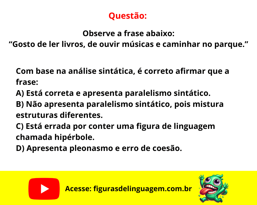 Resposta correta: B) Não apresenta paralelismo sintático, pois mistura estruturas diferentes.
